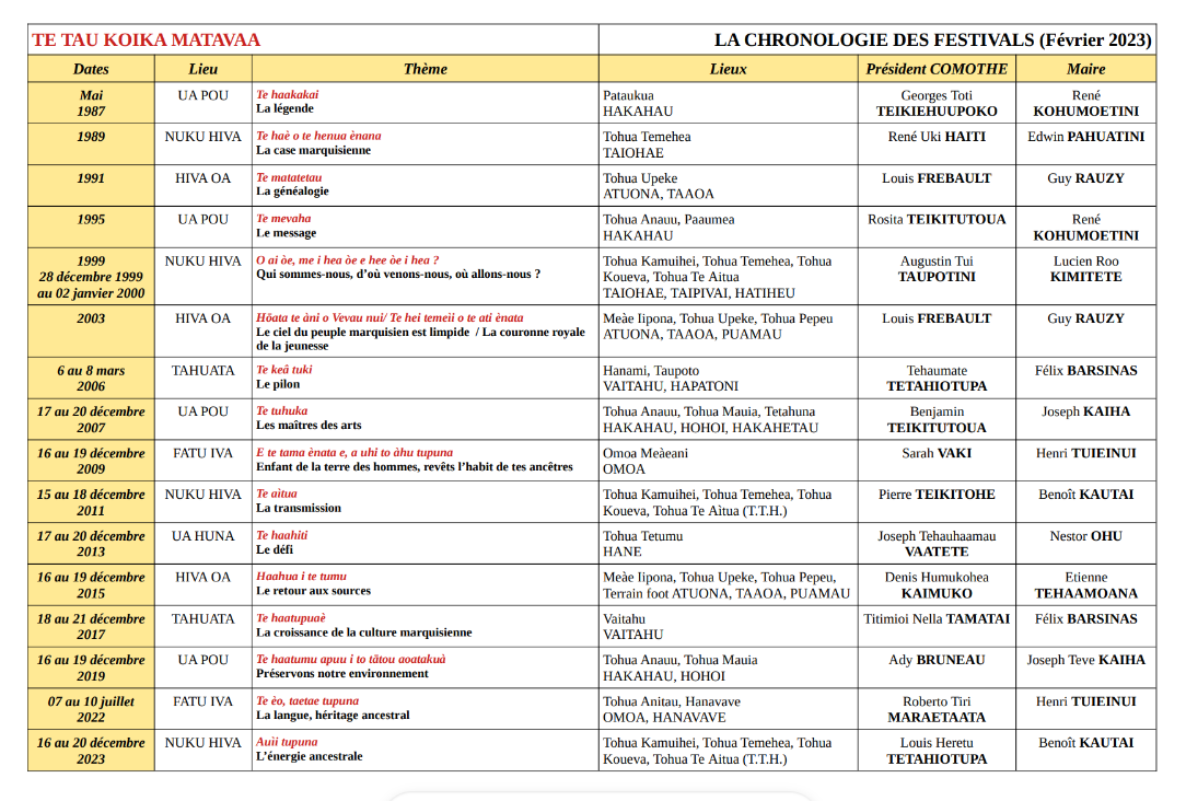 Il est organisé par le COMOTHE, Comité Organisateur du Matavaa o te Henua Enana.